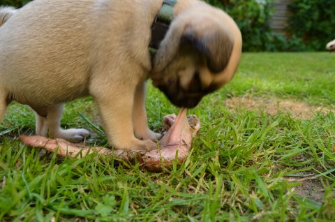 Hvalpene fik en rå kyllingevinge hver ude på græsset. De var helt vilde af begejstring.