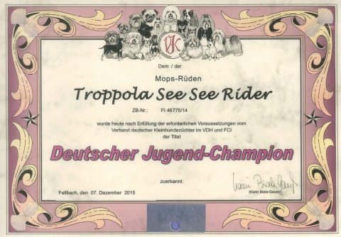 Han blev den 2. mest vindende mops i KSS Denmark Han fik også en tittel som Polens Vinder 2014 Samtidig fik han 2 nomineringer til CRUFT. Verdens største hunde show
