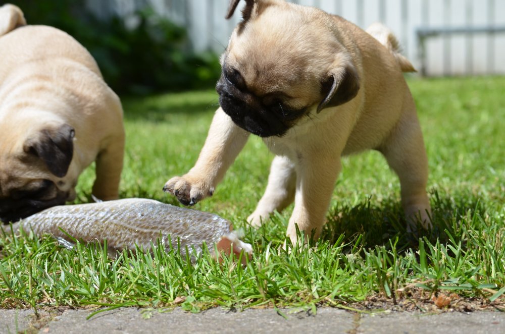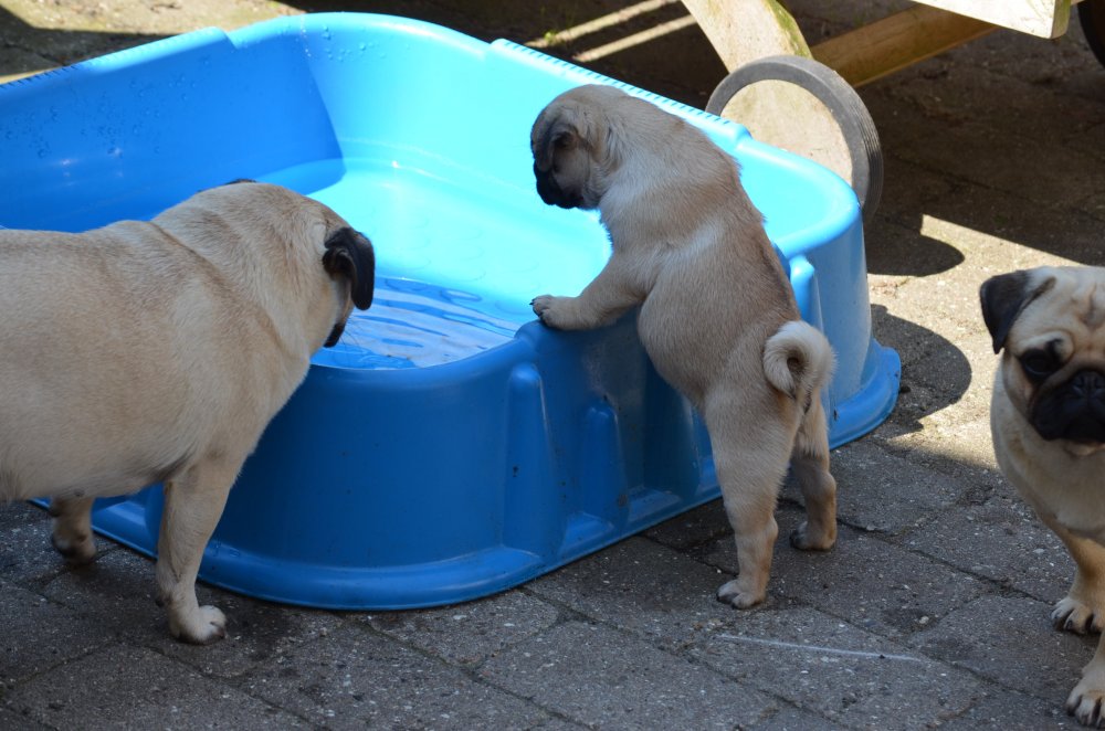 D 1 juni 2013. De 2 små hvalpe har for første gang fået en hel fisk de selv sku flå og spise. Det var et syn for guderne :) Det har også været dejligt vejr, så mopsernes lille soppebassin blev fyldt med vand. De elsker at soppe.