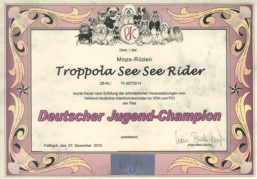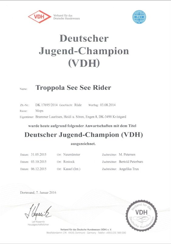 Troppola See See Rider står til rådighed som avlshan til tæver, der er stambogsført i DKK eller FCI.