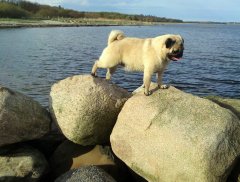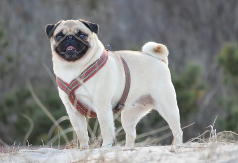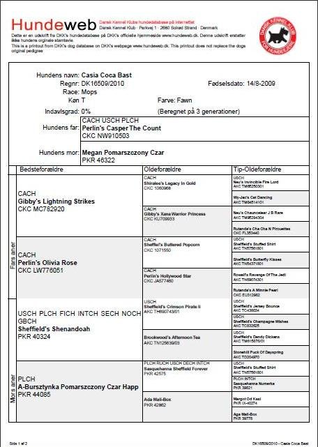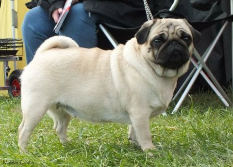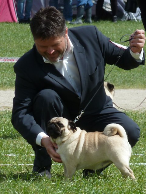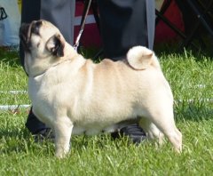 Velbåret rosenører, store mørke runde øjne, veludfyldt lige front, stærk hals og overlinie, dejlig glad temperament, korrekt højt ansat velbåren hale med dobbelt krølle, dejlig kort pels, bevæger sig korrekt let rullende med masser af action