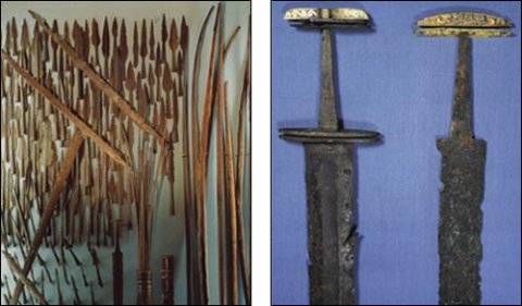Billedet til venstre viser blot en lille del af våbenfundene. Det kraftigste af sværdene i billedet til højre har en stor fæsteknap af bronze med nielloindlagt spiralornamentik. Sværdet blev udgravet ved dronning Margrethe II's besøg af hendes majestæt selv.