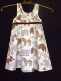 Please specify the size by the child's age (ages 3-8 available) and color choices (may choose 2: dress and ribbon). Photos show a white jungle print fabric with a brown velvet ribbon.