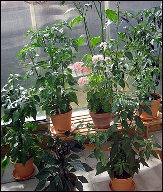 Bænken til højre, fra v. NuMex Suave Red, Aji Little Finger, Czechoslovakian Black. Foran Tabasco, 7. august