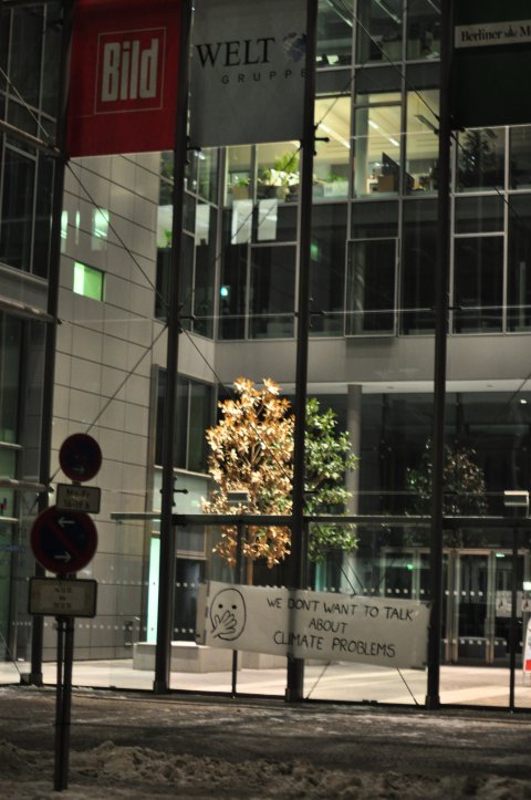 Det Rosa Forår har i nat hængt tre store bannere op i Rådhusparken i Århus, ved Christiansborg Slotsplads i København og på Axel Springer Haus i Berlin. Alle tre bannere fungerer som en sammenhængende kritik af den manglende fokus på klimaforandringerne.