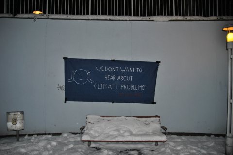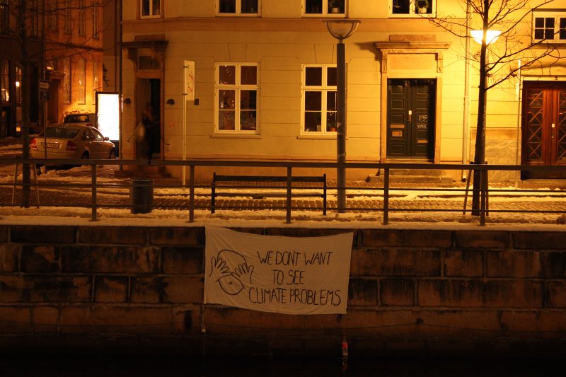 Nattens aktioner skal forstås samlet under overskriften ’ikke se, ikke høre, ikke tale’. Banneret i København er specifikt vendt mod de europæiske politikere med et krav om, at de igen åbner øjnene for klimaforandringerne. Sidste års håb om politisk vilje til at løse klimaproblemerne er forsvundet som dug for solen, og kortsigtede politiske emner har i stedet overtaget dagsordenen.