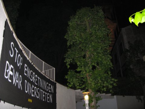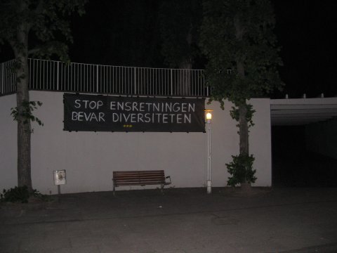 Dette banner er kl. 02:30 blevet hængt op på Park Allé ved Århus Rådhus for at vise vores utilfredshed med den borgerlige ensretning, som alle aspekter af vores samfund gennemgår i disse år. Regeringens forsøg på at ensrette enhver, lige fra studerede til indvandre, betyder at vi alle risikerer at ende som den samme borgerlige prototype: en samfundsborger, der hverken er kritisk eller nyskabende, men som blot tænker på egen succes og profit.