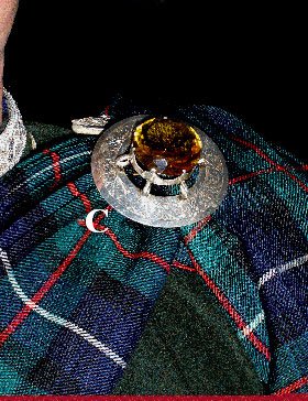 Denne holder plaiden på plads over skulderen. Den man ser på billedet er en Victorian alder plaid broche. Den er lavet af sølv og er lidt mere overdrevet end de senere udgaver. Plaid brocher fremstilles efter klan mærke eller regiment. Normalt er der indsat en store "Cairngorn Stone", som den ses på billedet. Cairngornerne er Skotlands højeste bjergrække og det er derfra, stenene udvindes. | |