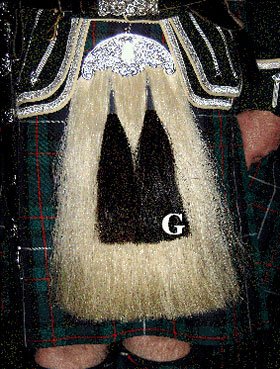 Kan bedst beskrives som en pung eller taske, der hænger foran over kilten. Den anvendes til at bære det nødvendige som f.eks. penge, nøgler mm., fordi kilten ingen lommer har. På billedet ses en militær sporran, som er lavet af hestehår. Disse forekommer i mange forskellige udgaver alt efter, hvilket regiment, der er tale om. Der fremstilles også sporrans til civil påklædning. De er som regel mindre og pyntes ofte med pels eller keltiske designs udskåret i læderet. | |