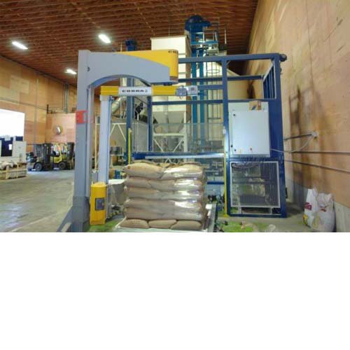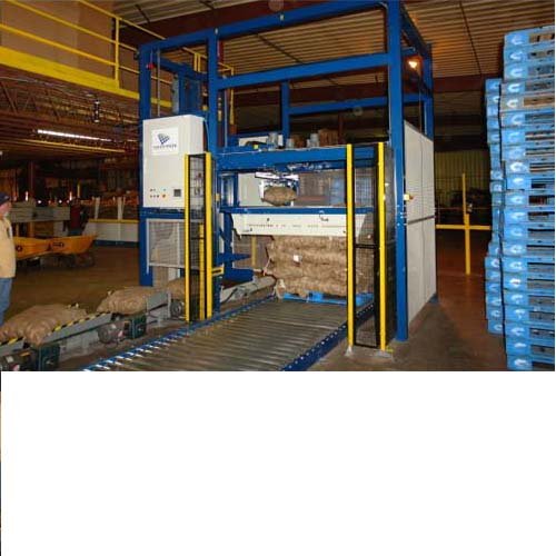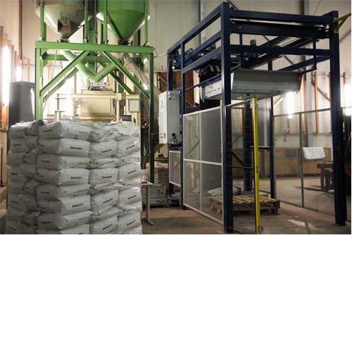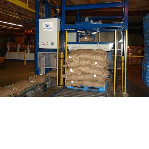 The VPM500 is a compact palletiser consisting of a main frame with a vertical bag lift, a gripper manipulator and a stacking collar. Optional, the palletiser can be expanded with an automatic pallet dispenser, a pallet conveyor system and a