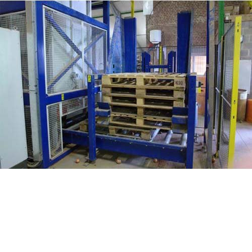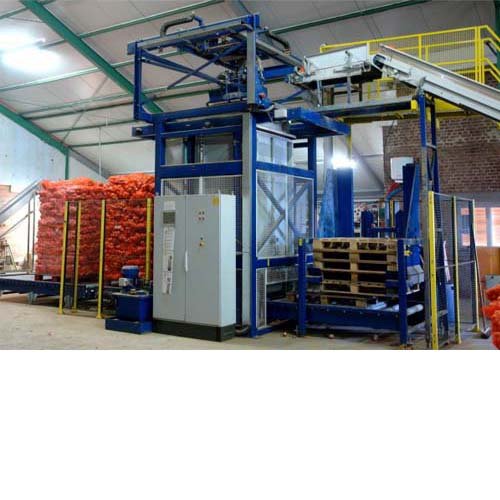 Bags are fed in using conveyor belts or a combination of conveyor belts and a vertical bag lift. The palletiser is standard equipped with a hanging manipulator, formation doors, a 4-sided closed stacking bin and a pallet dispenser. Pallets are fed in and out via pallet roller conveyors and chain conveyors.