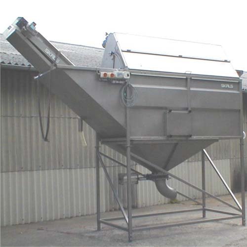 Vaskere med rustfri ståltromle med langovale udstandsede huller. Skånsom medbringersystem, og justerbar udløb. Rent vand sprøjtes via dyser over hvidt fødevarebånd i udløb. Kontaktflader i rustfri stål. Alle dele der er i konstant berøring med vand er malet med speciel anti corrosion maling. VTH. " keglebund ": Maskinen tømmes for slam/vand i bunden med en 150 mm ventil. Har renselem på den skrå bund. VTS. " Slæbekæde ": Slammet føres ud af maskinen med en skrabekæde. Slammet kan samles i en kasse bagved maskinen, eller føres til en central affaldsplads med transportør.