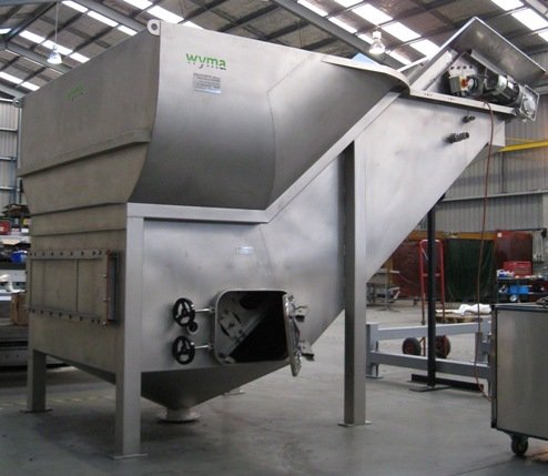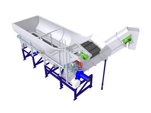 Produkternes videre transport i vandsiloen frem mod udløbs-elevatorbåndet sker desuden ved hjælp af et pumpesystem som pumper vand ind den bageste del af enheden. Pumpesystemet hjælper desuden til at produkterne generelt føres i en jævn strøm.