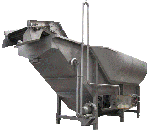 densiteten, vil de flyde over hulrummet ved hjælp af den opadgående vandstrøm, mens sten og jordklumper vil synke til bunds og blive udskilt via sten-elevatoren.