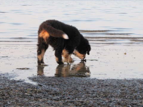Så har de små og Xillijan været ved vandet, de fik dyppet poterne, lugtet til tang og smagt på snegle og muslinger. De fik leger i sandet og i sivene, vi gik en runde på plænen og rundt om højen. De har alle snorket højlydt efter vi er kommet hjem. I eftermiddag kommer de enkeltvis ud på agilitybanen i snor, så skal det prøves :o)