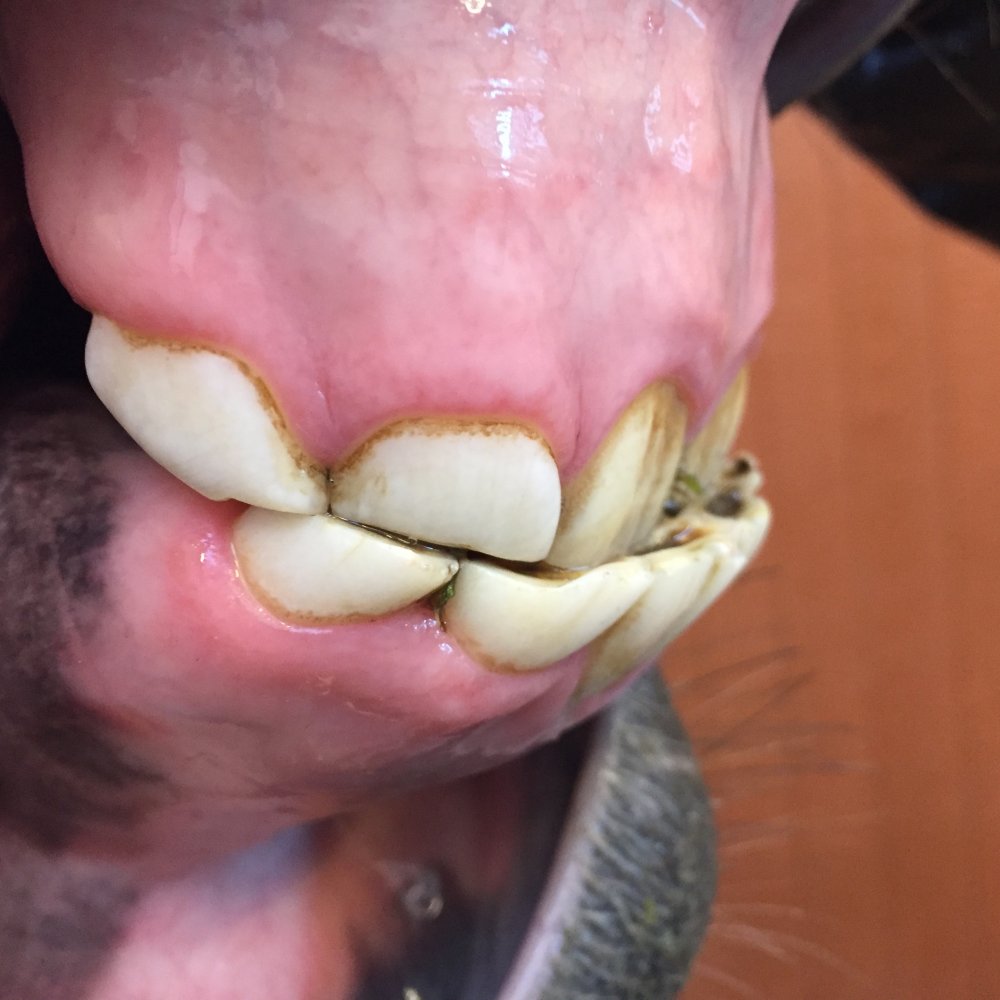 En grundig mundhuleundersøgelse viste, at den ene kindtand forrest i undermunden var meget for høj. Dette skyldes, at den modstående tand var slidt helt i bund. Den høje tand var begyndt at lave sår i ganen.