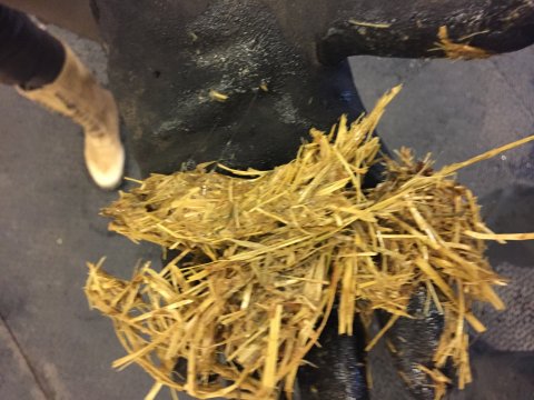 Du kan se to totter på billederne, som hesten har spyttet ud. Man kalder ofte sådanne aflange tyggede høklumper for cigarer/cigarruller.