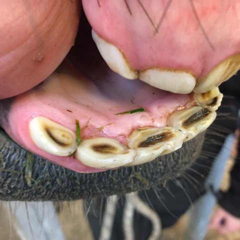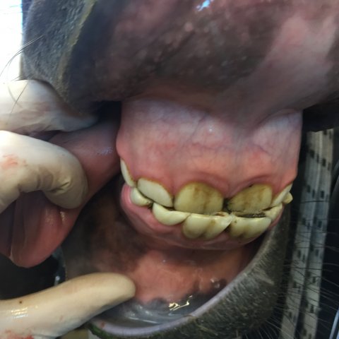 Denne shetlandspony havde et mellemrum mellem to kindtænder i undermunden som var ca. 0,5 cm bredt. Den modstående tand i overmunden er igennem mange år vokset ned i dette hul. Det er dog kun knap en halv cm. af tanden som er vokset ned og resten af tanden er i niveau med de andre tænder. Selv om hesten har præsteret holde sin vægt i mange år med dette, er der ingen tvivl om at dens tyggegunktion har været begrænset og tanden har forvoldt spændinger og smerter i hestens krop.
