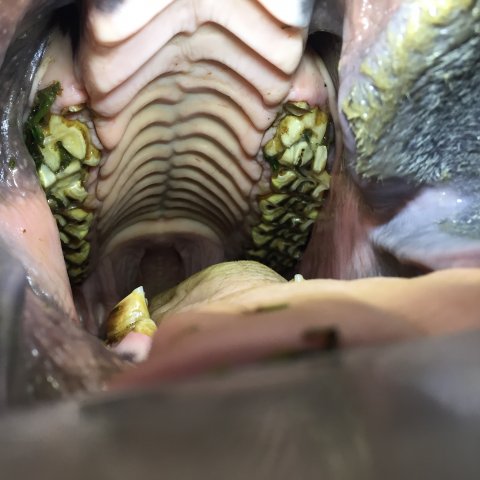 Der ses skarpe kroge på den forreste tand i undermunde, som har slidt den modstående tand.