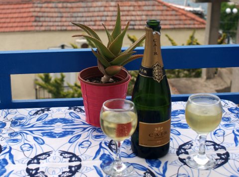 Evdokia er en munter, flink og imødekommende dame og hjalp os ivrigt med at komme op på 2. sal af de snævre trapper med vores ”heavy”-mærkede kuffert, selv om hun undervejs spurgte om vi måske hellere ville bo på 1.sal? Men efter at have set udsigten fra den øverste balkon var vi ikke i tvivl: det var alle anstrengelserne værd. Så vi betalte hende straks (for at slippe af med kontanterne) og påbegyndte en hastig udpakning og indretning, der dog fik en brat afslutning da Evdokia dukkede op med trist og beklagende mine for at meddele os, at hun havde begået en kæmpe brøler: hun havde givet os det forkerte værelse! Værelset med havudsigt var bestilte af nogle andre gæster, mens vi blot havde bestilt med balkon, hvilket der også var på det i øvrigt identiske værelse nedenunder. Ivrigt beklagende og brødebetynget hjalp hun os med at få pakket sammen igen og få flytte det hele en etage ned. Og som plaster på såret kom hun med pistacienødder og en flaske hvidvin – og endnu en omgang undskyldninger.