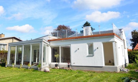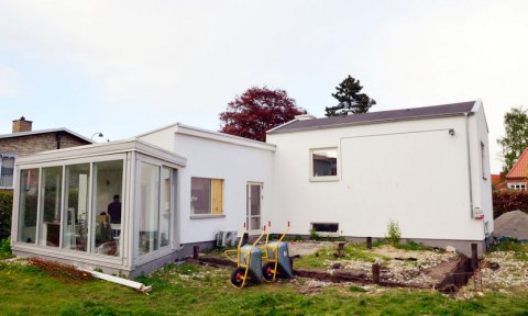 Førbillede, tilbygning på 40 m2 med tagterrasse |  Efterbillede, tilbygning på 40 m2 med tagterrasse | |