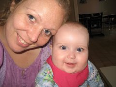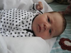 23. marts 2009 Jeg er nu blevet et halvt år og er bare en rigtig glad pige. Jeg har for alvor opdaget min stemme og snakker og hviner meget. Tit i det helt høje toner, så min familie er ved at få helt ondt i ørerne! Jeg er også meget optaget af mine hænder for tiden. Jeg holder dem op foran mig og drejer rundt med dem, imens jeg iagttager dem, meget spændende! Min soverytme er for tiden ikke helt stabil, men for det meste sover jeg 1½ time om formiddagen, 1½ time om eftermiddagen og kommer i seng imellem 19 og 19.30. Jeg sover indtil ved 23 tiden, hvor jeg får modermælkserstatning. Så sover jeg indtil kl. 4, hvor jeg igen får flaske, og så står jeg op ca. kl. 6.30. Jeg får grød en gang om dagen - for tiden er det hirsegrød med æblemos eller banan i. Om aftenen får jeg kartoffelmos med gulerødder eller broccoli. Jeg spiser det hele med velbehag og drikker også fint vand af et lille snapseglas. Ellers har jeg lige været til fotograf sammen med min storesøster. Jeg var noget paf og kunne ikke helt forstå, hvad det var for en mand, der blitzede og sagde underlige lyde, men det hele gik fint, og min mor og far glæder sig rigtig meget til at se billederne.