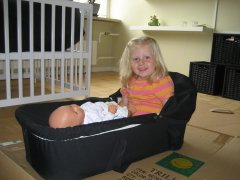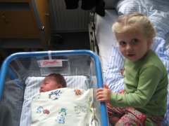 29. september 2008 Så er jeg endelig blevet storesøster! Jeg har nemlig fået en sød lillesøster den 20. september på min mors fødselsdag. Mor og far siger, at hun ligner mig på en prik, da jeg blev født, men så kan hun da kun blive rigtig dejlig :-). Jeg så min lillesøster første gang på sygehuset dagen efter, at hun var blevet født. Jeg synes, det var rigtig spændende at være på sygehuset og sagde hele tiden "Jeg skal være her hele dagen!". Jeg prøvede at holde min lillesøster i hånden, og hjalp mor med at køre hende i sygehusvuggen.  Den 22. september kom mor og lillesøster hjem, og mor og far synes, jeg har været den sødeste og dejligste storesøster, man overhovedet kunne forestille sig. Jeg er meget glad for min lillesøster og vil gerne være med i alt, hvad der har med hende at gøre. Jeg putter hende med dynen, giver hende sutten, hjælper med at pusle hende og skal lige kigge til hende, hvis hun "grynter" lidt. Nu nyder vi alle, at far har barsel. Jeg er afsted i vuggestuen for at holde min normale rytme og for at brænde noget krudt af, men får nok nogle kortere dage ind imellem.