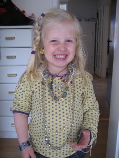 2. maj 2008 Alle ved det vist efterhånden, og nu kan mor heller ikke skjule det længere. Hendes mave bliver tykkere og tykkere for hver dag, der går, for hun har en baby derinde - jeg skal være storesøster! Vi regner med, at babyen kommer ud til os midt i september, og vi glæder os alle tre rigtig meget. Vi ved ikke, om det bliver en lillesøster eller lillebror - det bliver en overraskelse. Jeg ringede selv rundt og fortalte både mormor, morfar, farmor, bedstefar, onkel Jeppe og faster Helle, at jeg skal være storesøster, så det var skægt. Mor har desværre haft det ret skidt med kvalme under en stor del af graviditeten, så det er en ret fræk baby, der er derinde. Jeg kysser og aer meget på mors mave og smører indimellem creme på babyen (på maven). Mor og jeg har også læst bøger om at blive storesøster, så vi nyder "forberedelserne", selvom der endnu er lang tid til, at babyen kommer ud til os. Og så leger jeg for tiden meget med mine dukker. De hedder dukke Lise og dukke Frida, men ind imellem hedder de også Oskar og Mikkel, for mine veninder Ida og Laura har nemlig begge små babybrødre, og dem er jeg meget interesseret i. Så giver jeg dukkerne ble på og hiver op i trøjen, når de skal have mælk fra mine bryster! Ellers har jeg siden sidst været til konfirmation ved mors fætter Michael. Det var en af de dejlige forårsdage, så vi tilbragte meget af dagen udenfor. Den 26. april var vi til Idas 3 års fødselsdag i Grimstrup. Det var en rigtig dejlig dag, specielt nød alle vi børn at hoppe på Idas nye trampolin i haven. I onsdags var mormor med mig i vuggestue om formiddagen til bedsteforældredag. Det var bare så hyggeligt! Min vuggestue havde fået bevilget en masse frugttræer og buske, som alle bedsteforældrene skulle hjælpe med at plante. Derefter hyggede vi os med snobrød, frugtspyd, saftevand og madpakker. Tilsidst kan jeg lige fortælle, at jeg nu kun bruger sut, når jeg skal sove til middag og sove om natten. Det går rigtig godt, og jeg savner den faktisk ikke i løbet af dagen. Så om en måneds tid satser mor og far på, at sutten er fortid. Vi må se, hvordan det går!