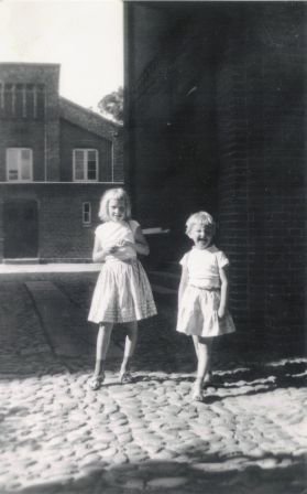 Mine søstre, Gerda og Birte på gårdspladsen hos mine bedsteforældre i [...]Skolegade klar til at gå i skole. Omk. 1960.Læs mere...↑ |  Gerda og Birte på vej i skole. De gik i Øvelsesskolen på Skolegade (nu [...]Kornmod Skole). Få år efter flyttede skolen til nye bygninger på Århusbakken. Omk. 1960.Læs mere...↑ |  Mine søstre. Fra venstre Birte og Gerda. Omk. 1954. |