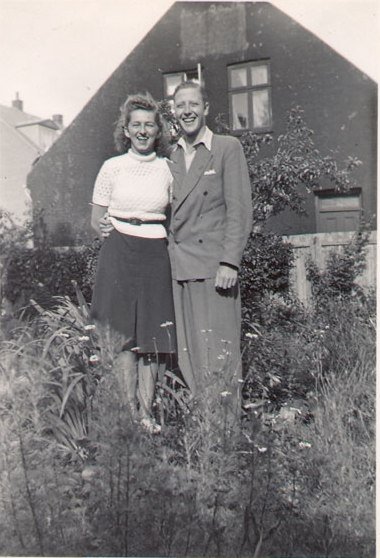 Min mor og far, Inga og Axel Frandsen, i haven, Skolegade 51 i Silkeborg,