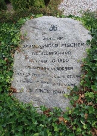 "Her nedlagdes Støvet af Allinggaards, Gravballegaards, Vinderslevgnards forrige Ejer Velbyrdige Jean Arnold Fischer, som fik Livet d. 29. Januar 1749 og tilbragte det i gavnlig Virksomhed indtil d. 8. Januar 1805, da en overraskende Død kaldte ham fra dæne Verden, hvor hans Daad er hans Minde".