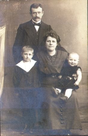 Magna Birtine Wigant, Født Sørensen, med børnene Charles, Aage, Vera og [...]Rita. Omk. 1912. Magna levde som enke resten af livet . Hun døde i 1974.Læs mere...↑ |  Min oldemor, Mette Kathrine Larsen, Født Danielsen, gårdmandsdatter fra Vinderslev. Årstal ukendt. |  Min oldefar, bedstes far, Jens Peder Larsen, husmandssøn fra sinding. Årstal ukendt. |